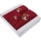 Ensemble de cadeau de 3 pieces de serviettes brodees en 100% coton, a motif Canteiro (Voir description) (Rouge/Fleur creme)